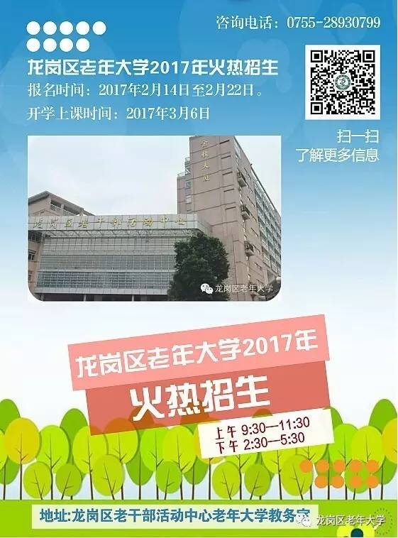 龙岗区老干部活动中心老年大学教务室(中心城如意路金秋大厦706室。可乘地铁3号线爱联站、839、365、M447、M280、33、35、M386、E5路公共汽车在区老干部活动中心站下车)。
