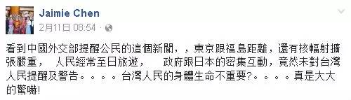 参考消息网-锐参考梳理发现,对于日本核辐射的警讯,“不靠台湾靠大陆”的态度成为台湾网友的共鸣。还有网友讽刺台湾当局“心真大”,同时呛声台湾绿营媒体:“苹果三立自由怎么一点消息也没有?”