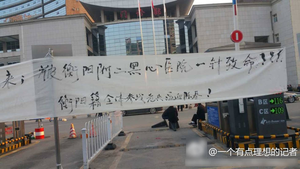 据澎湃新闻网、衡阳新闻网报道,2017年2月11日,湖南衡阳南华附二医院发生一起纠纷,当日上午,衡阳县某陶瓷厂55岁男性职工秦某芽在该医院就诊肌肉注射后身亡,随后其家属与院方发生纠纷,死者亲友在该医院放鞭炮,烧纸钱,并与医院的义务消防队员(即安保人员)发生推搡,双方均有人员受伤。13日,衡阳市公安局公开通报称,事发后警方迅速赶赴现场处置,目前医院秩序已恢复,医院与死者亲属正在协商有关善后事宜。供图:@一个有点理想的记者