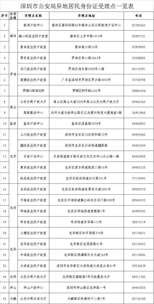 目前深圳市共有26个异地身份证办理点: