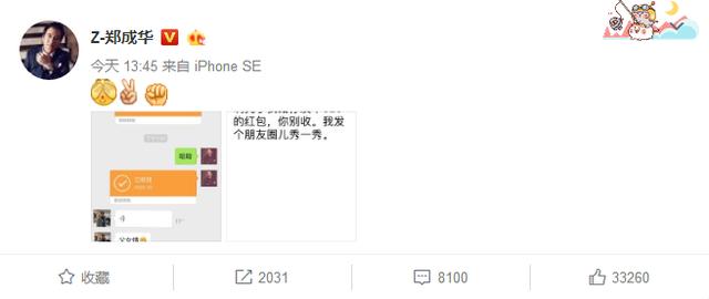 而郑爽的爸爸拖着女儿郑爽“作秀” ,他发520块红包给郑爽却不让收,他说:“壳子,我给你发个520的红包,你别收。我发个朋友圈儿秀一秀”。