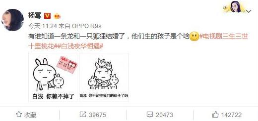但最近《三生三世十里桃花》正在热播的杨幂,情人节不拉上刘恺威秀恩爱,反而是在微博上讨论剧中“龙和狐狸结婚,生的孩子是啥”?