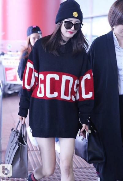 杨幂身穿GCDS黑色打底红色条幅的大字母毛衣,这件毛衣被大幂幂改良成了下半身消失款,再配上同色系毛线袜,这样穿的杨幂绝对是机场的焦点,回头率特别高。