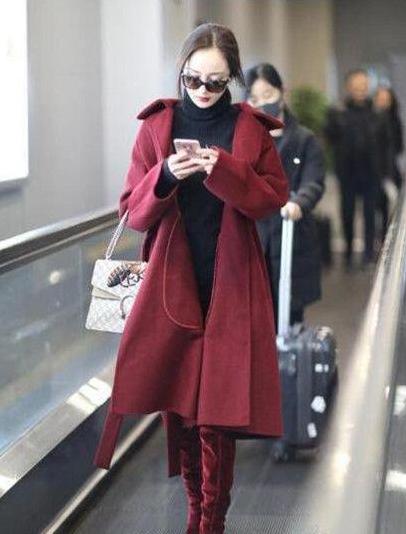 杨幂身穿一件酒红色的长款大衣,气质满分,翻领的设计显得十分霸气,内搭黑色的高领连衣裙,十分保暖时尚,脚踩酒红色的过膝长靴,显得十分复古时尚,杨幂真不愧是“穿搭女王”。