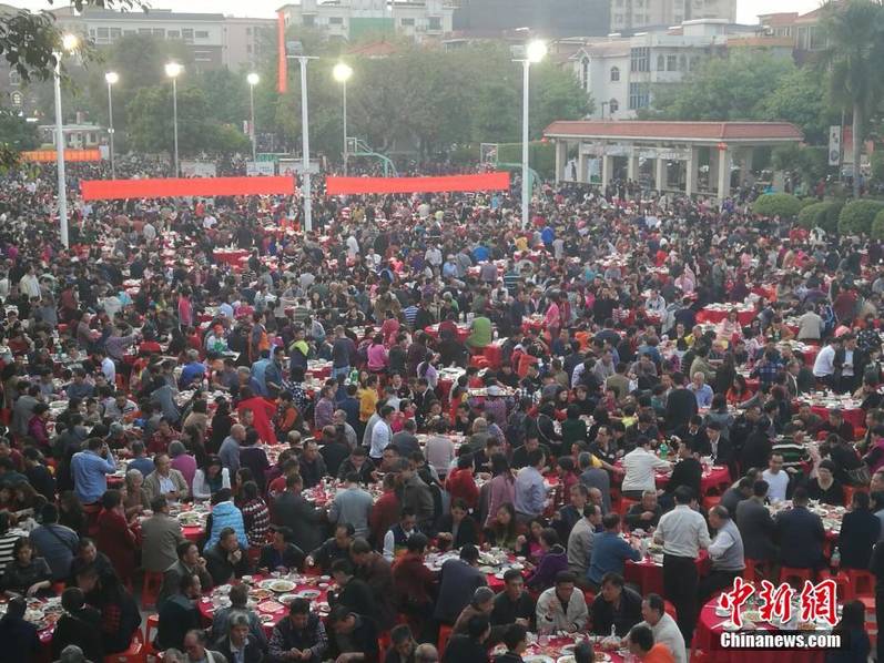 广东东莞麻涌镇大步村“万人围宴”2月15日晚在麻涌镇大步体育公园举行,大步村筵开2100多席,2万多人赴宴。 李获摄