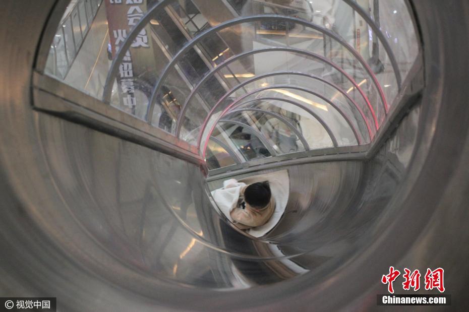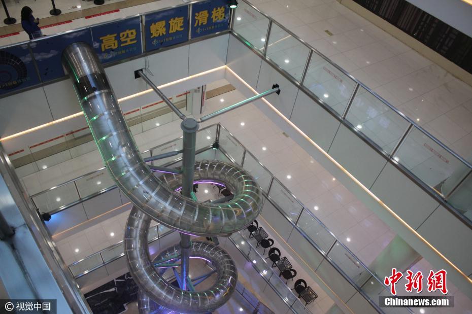 2017年2月15日,重庆,一座高空螺旋滑梯亮相重庆一商场4楼。滑梯从4楼螺旋下降到1楼,高16米,长46.8米。体验速度与激情,从滑梯空降到底楼,仅需12秒。图片来源:视觉中国