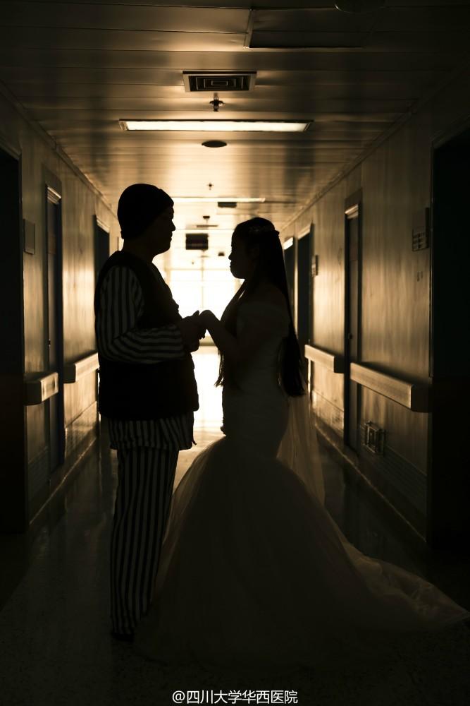 2月15日,情人节第二天。林寒披上了婚纱,等待男友到来。走廊里,传来鞋子摩擦地面的声音,他近了。门打开的那刻,她强忍住眼泪咧着嘴,笑地很开心。婚纱、她和他、摄影师……这样的场景,他们等了一年多。但唯一不同的,是拍照地点在华西医院病房,祝福声则来自医生与护士。