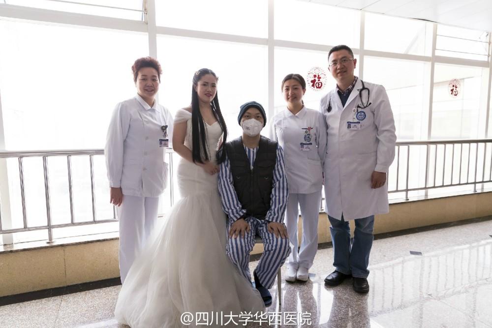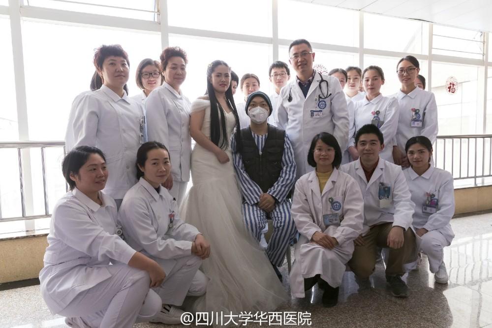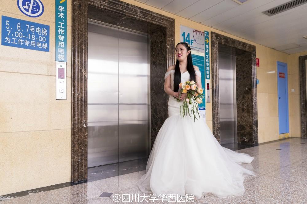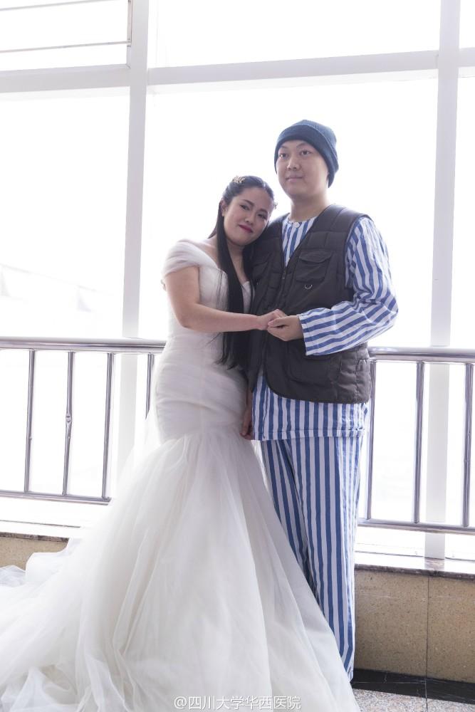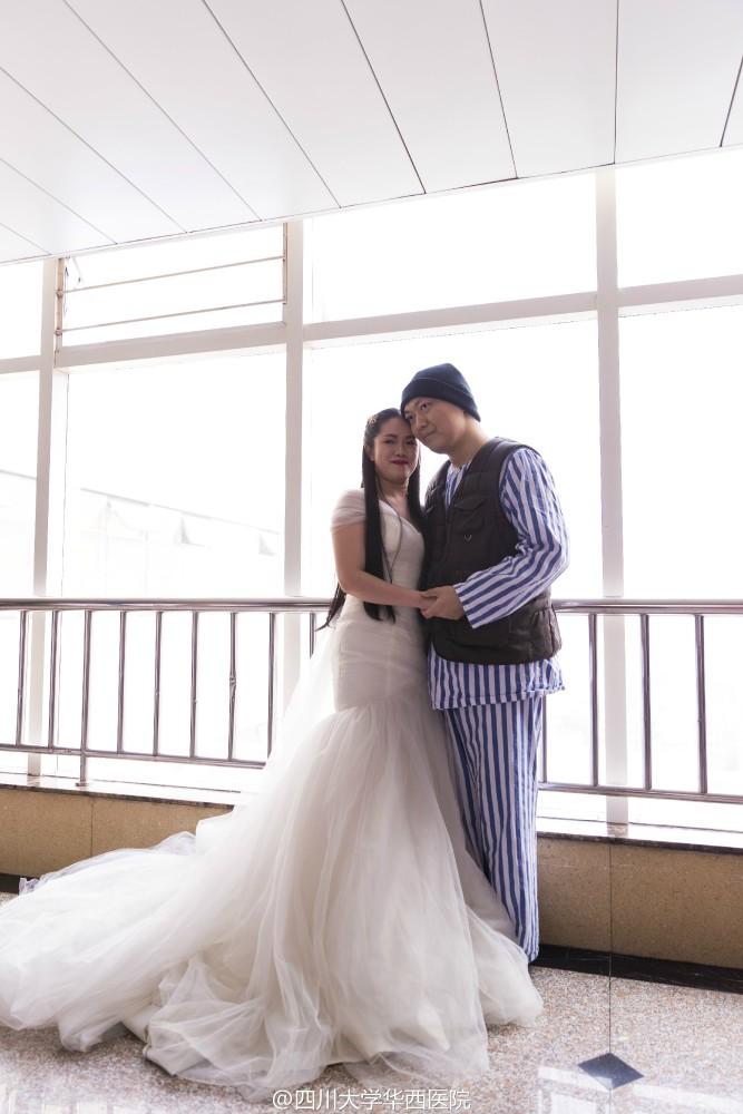 2月15日,情人节第二天。林寒披上了婚纱,等待男友到来。走廊里,传来鞋子摩擦地面的声音,他近了。门打开的那刻,她强忍住眼泪咧着嘴,笑地很开心。婚纱、她和他、摄影师……这样的场景,他们等了一年多。但唯一不同的,是拍照地点在华西医院病房,祝福声则来自医生与护士。