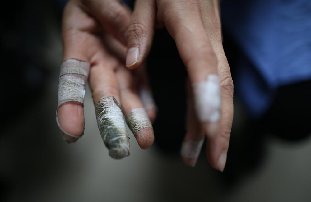 昆明公交公司的“点钞员”做的就是这样日复一日、年复一年清分、清点零钱的工作。图为双手裹满胶布。
