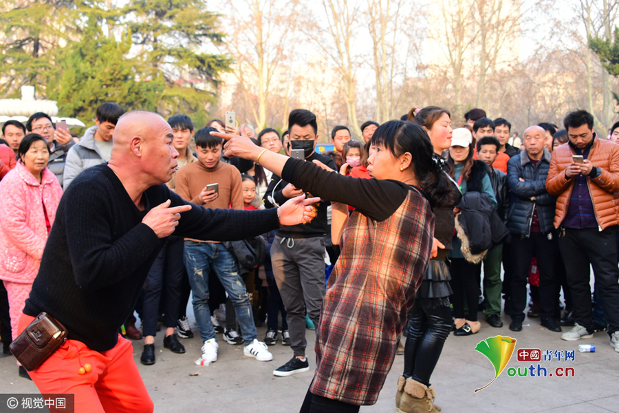 2017年2月18日,郑州人民公园中心广场内,“双枪老大妈”王玲芝与同伴跳起来他们自创的“逆天摇摆抽筋舞”,引数百人围观,而现场直播更是受到全国各地舞友的热捧。图片来源:李四信/视觉中国