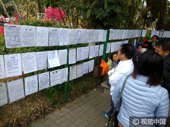 2017年02月19日,广东省深圳市,热闹非凡的深圳莲花山相亲角,征婚广告挂到树上。