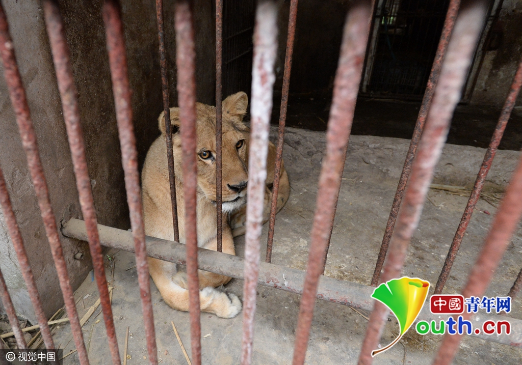 再往上一个不足20平米的笼子住着一只快20岁的老年母狮。笼子外的牌子写着:非洲狮,产于非洲属大型动物,喜群居,在辽阔的草原上团结一致捕食猎物。牌子下方狮子蜷着睡觉,看上去像体型稍大的松狮。