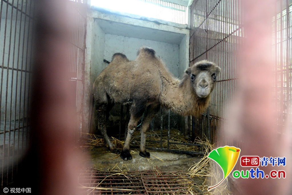 最上端的笼舍关着一只趴在地上的骆驼,我们无意中掀开搭着的篷布才发现它,它惊恐地突然站起来往后缩,其实这个笼子刚好能容它转个身,但因为脖子被铁链套在栏杆上,它也转不了身。