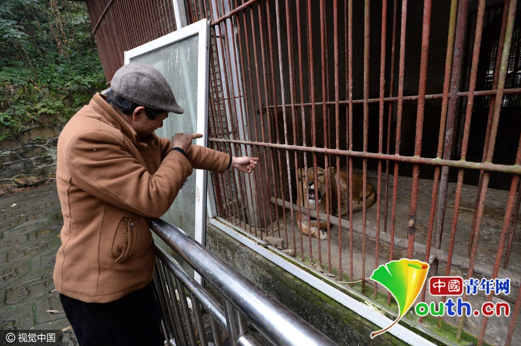 “它最怕的还不是棍棒,是麻醉枪。”谭德倒拿扫把,作抱枪射击状,狮子赶紧从墙壁一个小洞钻进隔壁,匍匐在地上,嘴里发出嘶嘶的哈气声。此时有游客上来,谭德才和游客都哈哈大笑。