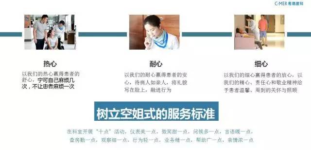 社会办医院中的“佼佼者”深圳市希玛林顺潮眼科医院则树立了空姐式的服务标准,在科室开展“十点”活动,仪表、微笑、问候、言语、查房、观察、行为、业务、帮助、亲情都要好一点!