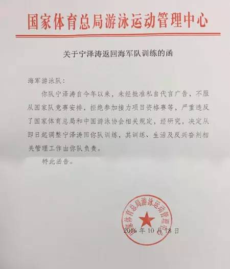 从曝光的文件内容看,文件是游泳中心发给海军游泳队的公函,“决定从即日起调整宁泽涛回你队训练,其训练、生活及反兴奋剂相关管理工作由你队负责。”至于理由,文件称宁泽涛严重违反了国家体育总局和中国游泳协会的相关规定, “你队宁泽涛自今年以来,未经批准私自代言广告,不服从国家队竞赛安排,拒绝参加接力项目资格赛等。”