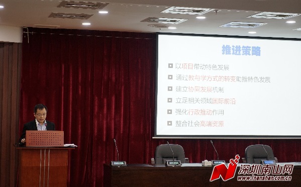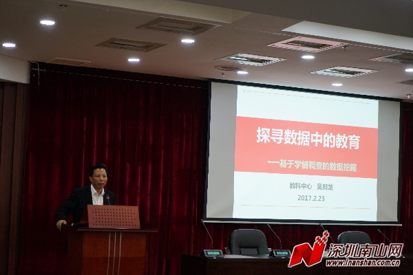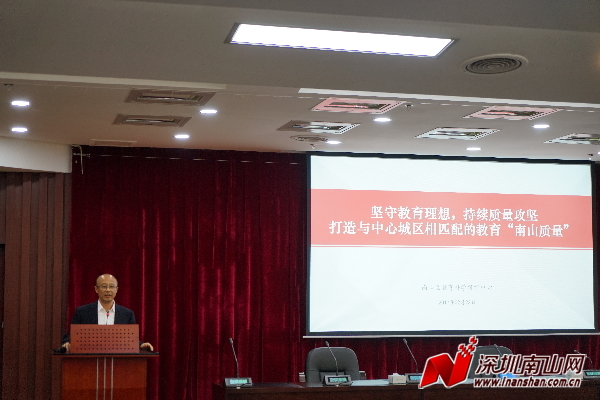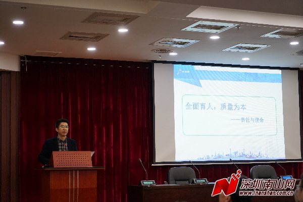 在南山区教育工作部署会议上,南山区教育局教科中心负责人余耀贤以“坚守教育理想 持续质量攻坚---打造与中心城区相匹配的教育'南山质量'”为题对新学期教学工作作了具体安排,教科中心副主任、教研室主任吴熙龙作了《寻找数据中的教育》专题报告,教科所副所长刘治刚解读了“1+7”南山特色教育发展顶层设计方案。