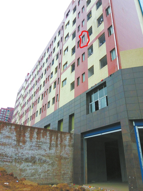 许某运坠亡的宿舍楼,红圈标注的地方便是其坠亡的厕所窗台。