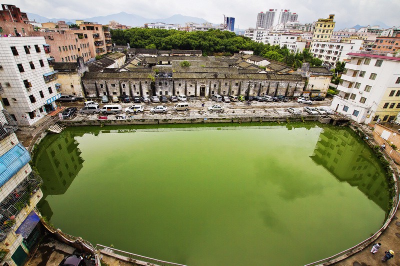与别的客家围屋不同,龙田世居三面环水,水面宽约16米,呈半圆形,另一面是高大的围墙,水面上一座小桥,通往对岸的一个亭子。这个半圆形的河岸与外墙成“龟背”状图案,为各地围屋所少见。围屋四周的花园曲径通幽,走进花园犹如走进欧洲中世纪的古堡花园,绿树鲜花散发出来的芬芳令人陶醉,这是典型的岭南客家式的地主庄园。