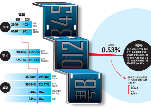 深圳新闻网讯 昨日15时,2017年第2期深圳市小汽车增量指标竞价结果出炉,个人车牌指标均价逼近4万大关!竞价全过程由公证处予以公证。此外,昨日深圳市2017年第2期普通小汽车增量指标摇号成功举行,参与摇号人数接近63万,创造历史新高,摇号中签率为0.53%。(记者 谢丽雯)