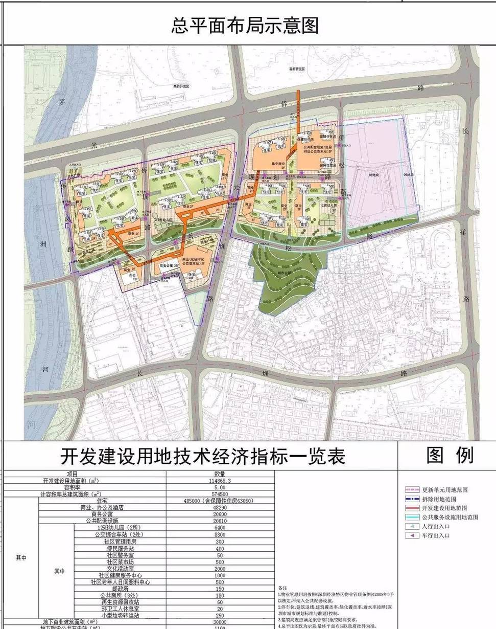 更新单元用地面积20.7万平方米,开发建设用地面积11.5平方米,计容积率建筑面积57.5万平方米,其中:
