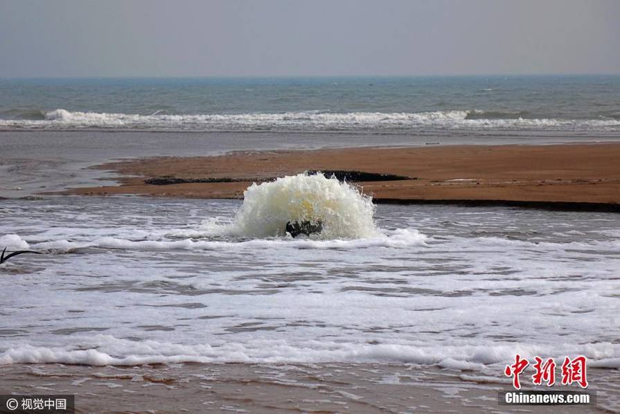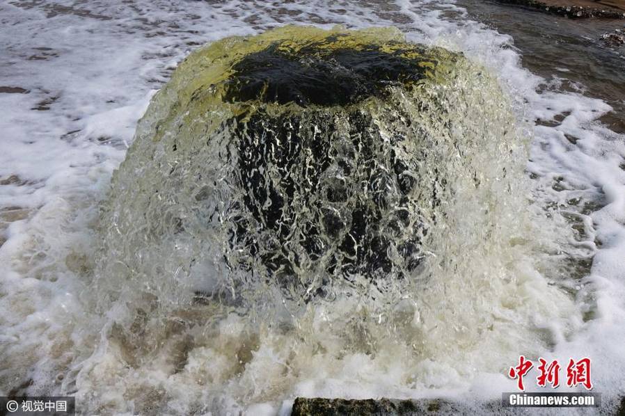 2017年2月28日,山东青岛正值天文落大潮,裸露在灵山湾海滩上的市政排水井暴涌状如“蘑菇泉”,场面甚是壮观。来源:视觉中国