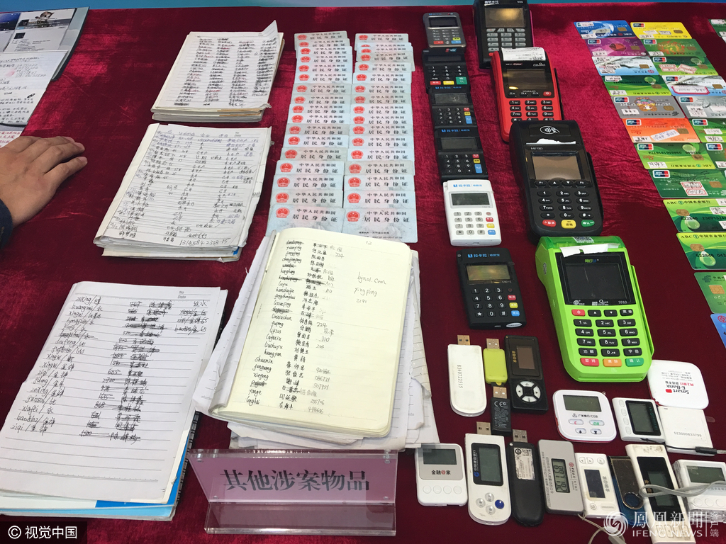 据悉,2016年年底,广州市公安局摧毁了一个买卖公民个人信息的团伙,经过扩线经营,又排查出6个涉嫌侵犯公民个人信息犯罪团伙。图为警方查扣的银行卡2000余张和电脑、手机、存储设备一批。