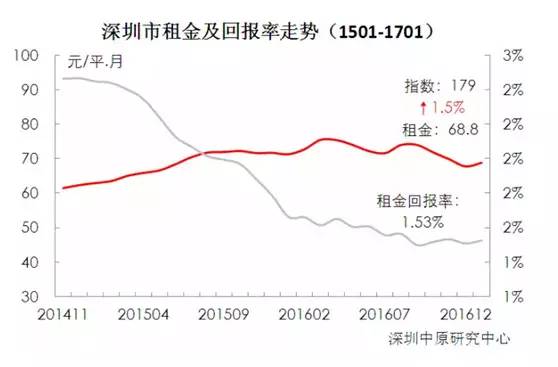 此前,有数据显示,从2016年6月到2017年1月,深圳的各区房屋都出现了不同程度的下跌,全市跌幅4.7%,宝安跌幅最高达7.4%。但这种下跌的状态到了今年似乎要画上句号,从近期深圳中原研究中心的数据中可以看出,2017年1月全市实际租金已经环比上涨1.5个百分点,租金水平达到68.8元/平,不过,因为受到去年楼市整体氛围趋淡影响,今年春节节后房租还是比去年1月租金水平降了1.2个百分点。