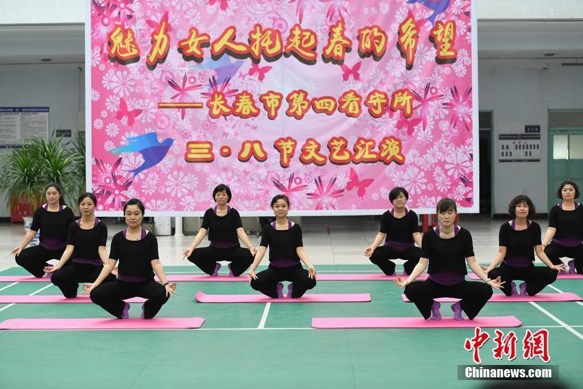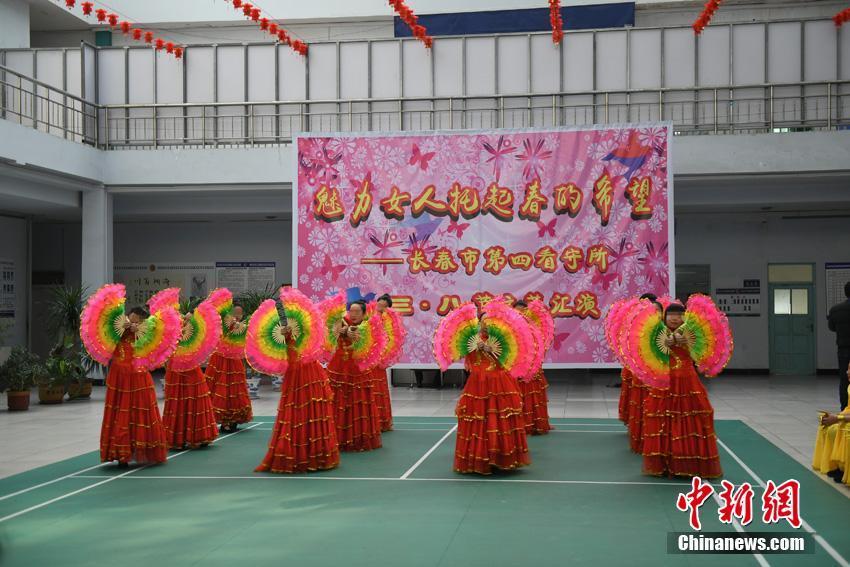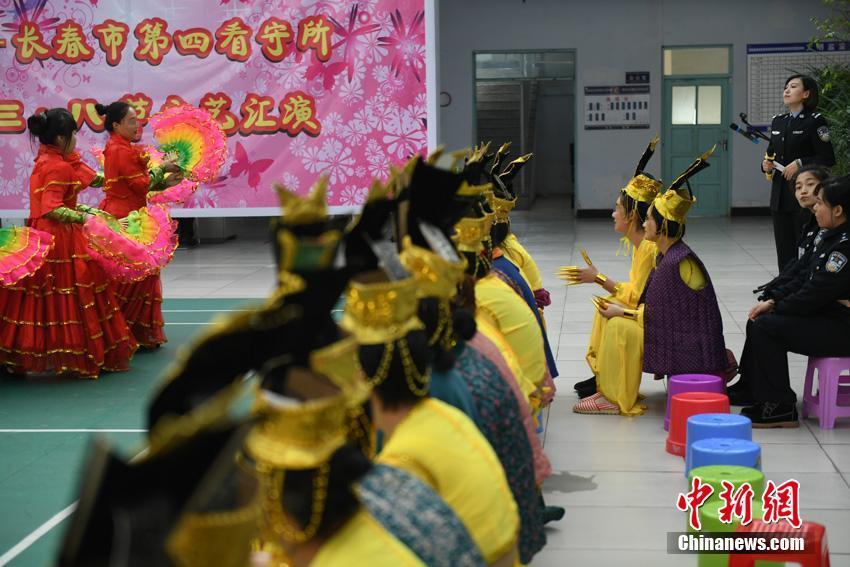 3月6日,在“三?八”国际妇女节前夕,长春市第四看守所的民警和在押人员共同演绎了一场以“魅力女人托起春的希望”为主题的三?八节文艺汇演。民警和在押人员表演了歌舞、诗朗诵等节目。此举意在丰富监所警营文化生活,教育引导女性在押人员树立自尊自爱自立精神。图为民警表演的傣族舞蹈,将演出推向高潮。张瑶 摄