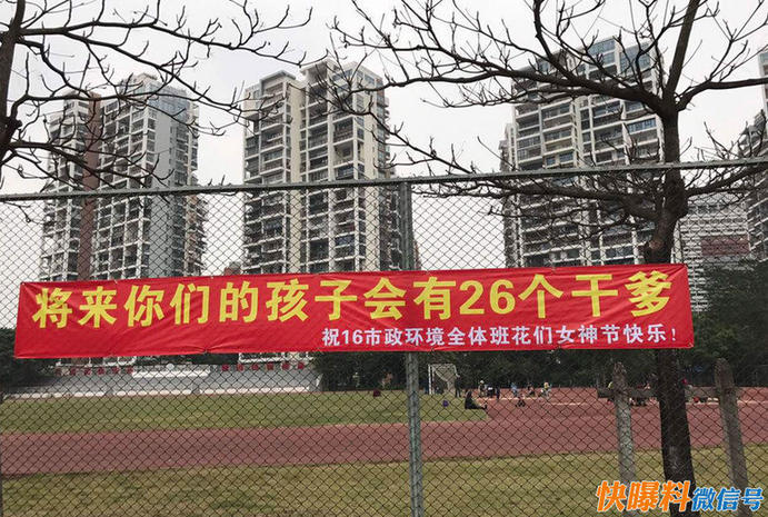 7日上午,哈尔滨工业大学(深圳)校区学生涂同学向“快曝料”微信号报料,称7日女生节校园里出现各种逗趣的标语,市政环境专业打出“将来你们的孩子会有26个干爹”,土木与环境工程学院献给土木六小花“管他男女几比几,我们心中只有你”,还有经济管理学院本科全体男生的“经管女孩,是爱,是暖,是希望”。