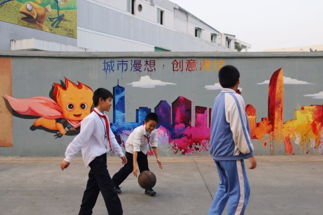 (放学的学子经过涂鸦墙,远远看去,少年的身影映在巨大墙体中,就像一幅绚丽的画卷。)