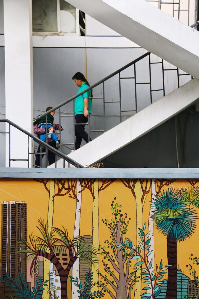 (下楼散步的市民。一家人的幸福图景与美丽的涂鸦相互映衬。)
