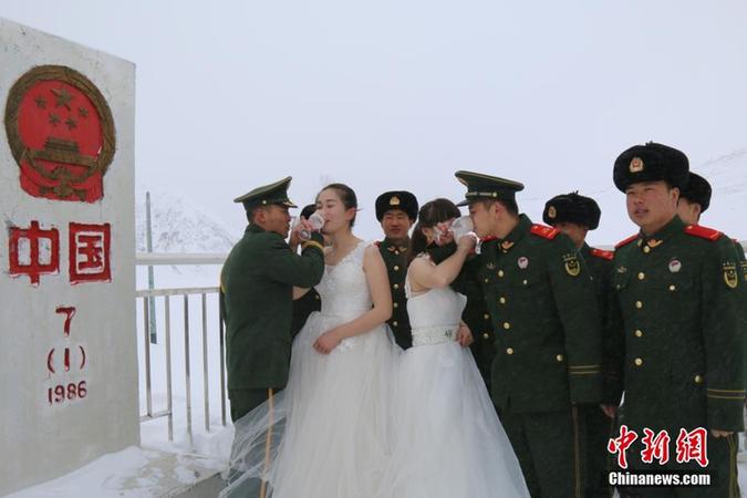 3月6日,武警新疆边防总队红其拉甫边防检查站为三名官兵在海拔5100米的中巴边界举行了简单而有意义的婚礼。图为新婚夫妇在喝交杯酒。李康强 摄