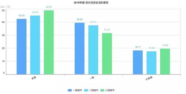 “小城市”幸福感来自哪里?简言之就是“十项全能”——对目前生活状态的打分,从收入状况到食品安全,从住房条件到交通出行,大调查列出的10个选项,地级市全面超越直辖市和省会城市。“小城”居民不仅感到幸福,对未来也更充满信心。大调查发现,有56.73%的地级市受访者认为2017年他们的收入将会增加,远超过大城市。预计收入会减少的比例,也低于大城市。