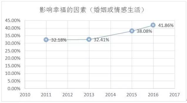 从整体趋势来看,“收入水平”、“社会保障”对幸福感的影响已经不再像十年前那么显著,而婚姻情感的影响却在上升。正所谓家和万事兴,一份和谐的家庭关系、一份真诚的情感,对人们的幸福是有多么重要。