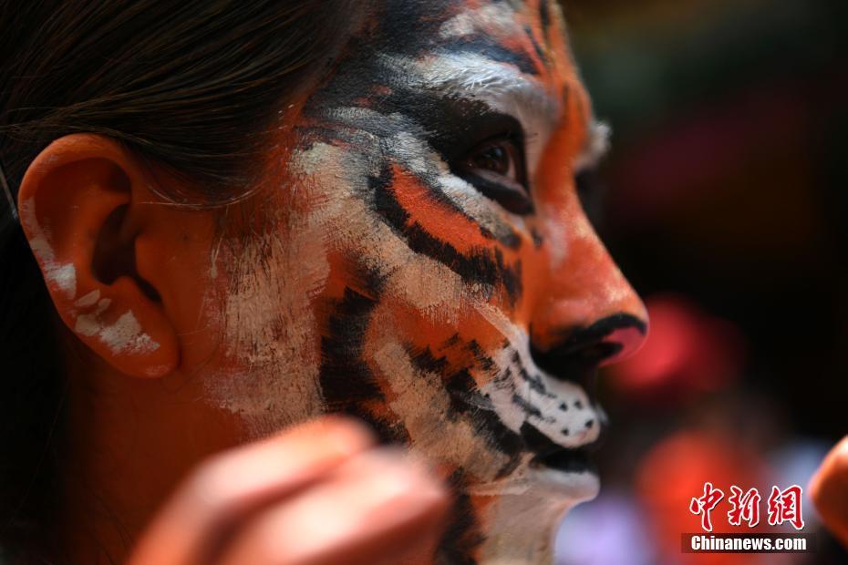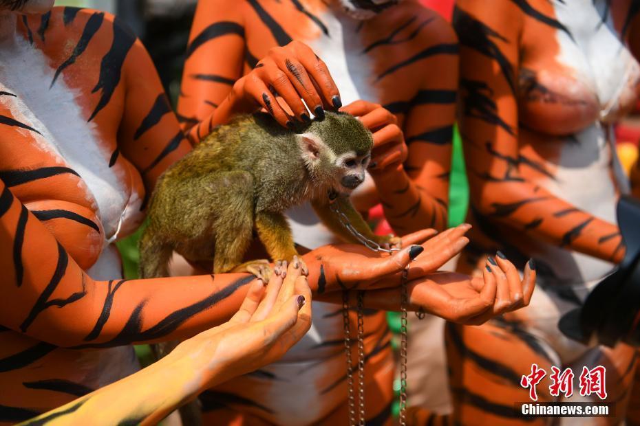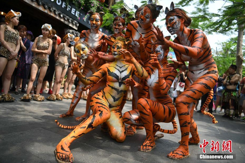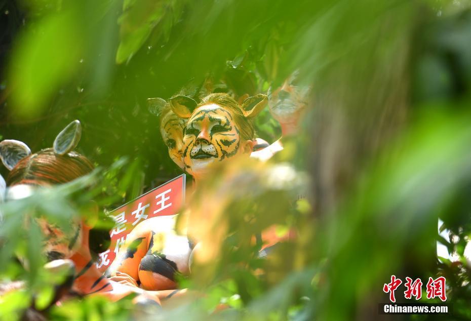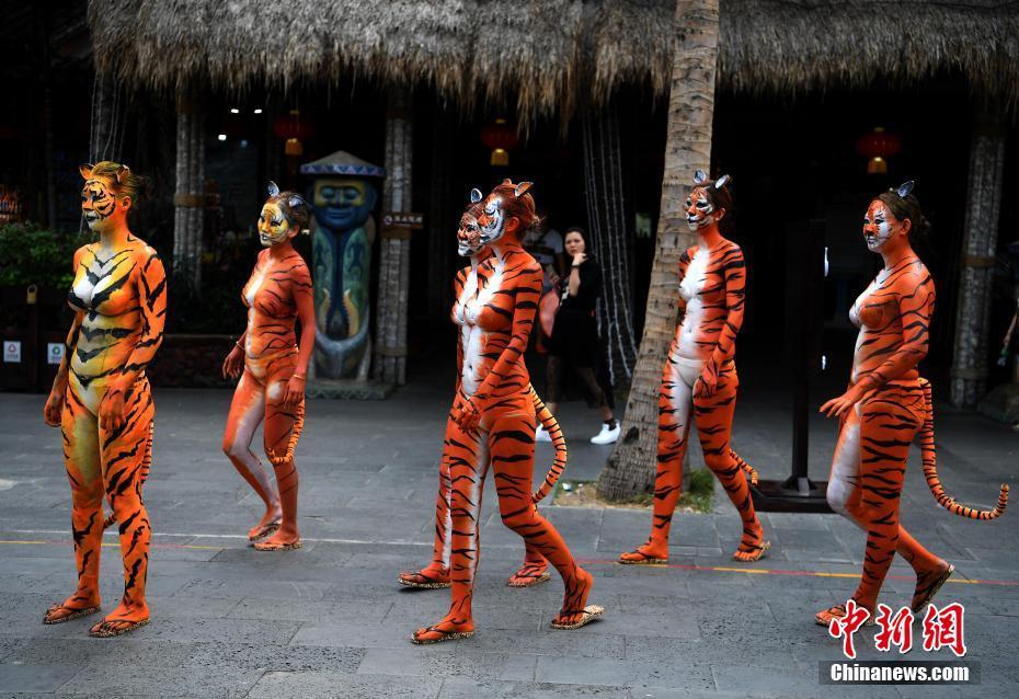 3月8日,“三八”妇女节,三亚宋城彩色动物园举行人体彩绘活动,多名模特身体被彩绘成老虎的模样在动物园内进行表演,她们用行为艺术的方式呼吁忙碌的女性们要懂得释放压力、还原自我。陈超摄