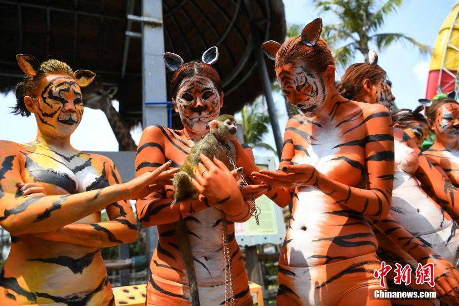 3月8日,“三八”妇女节,三亚宋城彩色动物园举行人体彩绘活动,多名模特身体被彩绘成老虎的模样在动物园内进行表演,她们用行为艺术的方式呼吁忙碌的女性们要懂得释放压力、还原自我。图为模特被彩绘成老虎模样在动物园内表演。陈超摄