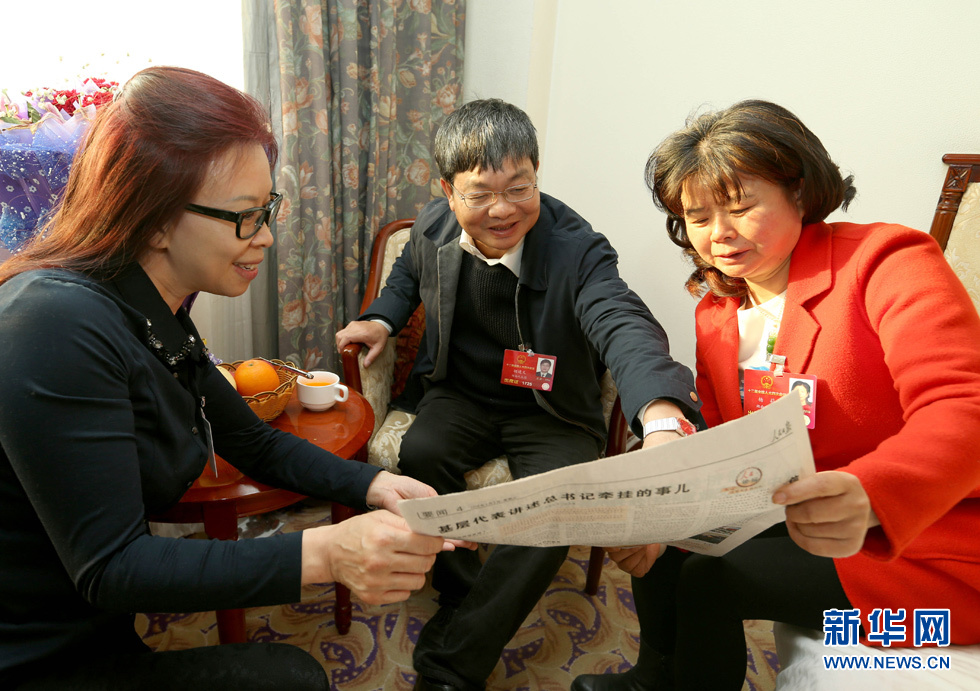 2016年3月12日,全国人大代表杨莉、胡建文、雷冬竹(从右至左)在驻地讨论报纸上的两会新闻。湖南省岳阳市屈原管理区凤凰村村委会主任杨莉,连续当选为十一届和十二届全国人大代表。她表示,一名来自基层的全国人大代表要履好职、当好代表,简单说来就是用心,要当好“三人”。要做“明白人”,明白自己的职责,做到明明白白履职,扎扎实实为民;要做“贴心人”,深入基层,全面准确把握社情民意,如实反映群众的心声;要做“实在人”,有对党对人民高度负责的主人翁态度,实事求是调查研究。杨莉认为,提出好的议案、建议是用心履职的基本表现。好的议案、建议不仅需要提出问题,还要给出有针对性的解决方案。10年来,她提交的建议和意见涉及农村建设、农村教育等方面,近200条,其中《关于加大对农村水利建设投入的建议》等10条建议被全国人大列为重点建议。杨莉说,重视调研是用心履职的一项重要内容。这些年,她自费走访了湘、鄂、赣、粤、鲁五省的60多个乡镇进行调研,运用手机短信、电子邮箱等方式收集百姓关心的问题及解决问题的意见和建议。杨莉生长在洞庭湖畔的农村,她通过多次走访调研,提出的《关于湖区渔民上岸安置和解困工作的建议》最终推动解决了渔民上岸生活的问题。2013年,杨莉对湖南、湖北境内农村河渠进行调研后提出的《关于疏浚河渠、解决农村水利建设难题的建议》被全国人大列为重点处理建议。随着我国农村情况的不断变化,杨莉的关注点和着力点也在转变,由关注解决农村人口温饱问题,利用现代农业科技帮助农村人口脱贫,转化为关注农村产业发展,让农村群众走上致富路。从2013年至2017年,记者用连续五年的影像记录了杨莉用心履职的点点滴滴。新华社记者 陈建力 摄