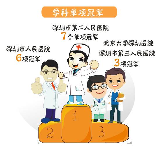 此外,深圳市人民医院也夺得了6个单项冠军,北京大学深圳医院和深圳市第三人民医院各夺得3项,深圳市儿童医院夺得2项。