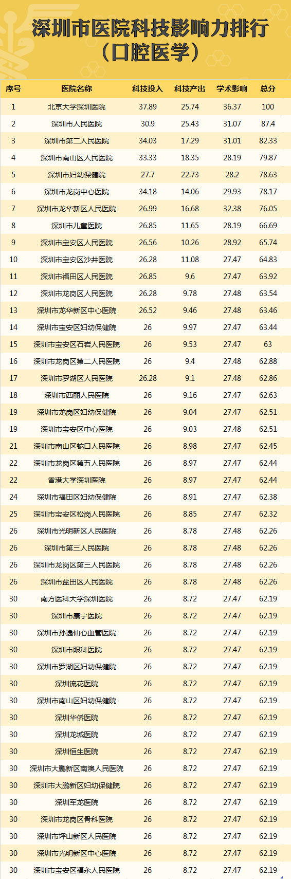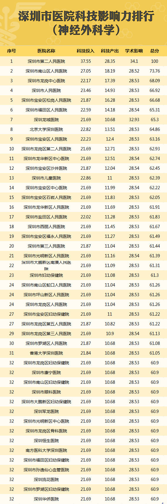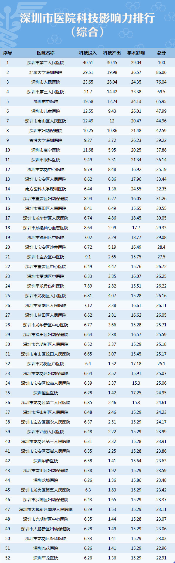 3月9日,深圳市召开全市卫生计生科教工作大会,深圳市卫生计生委首次发布了医院科技影响力排行榜——深圳市“十二五”医院科技影响力排行榜,这是委托委托中国医科院医学信息研究所制定的第三方权威排名,对全市52家二级以上医院进行了评估,形成综合榜单和26个学科的单项榜单。