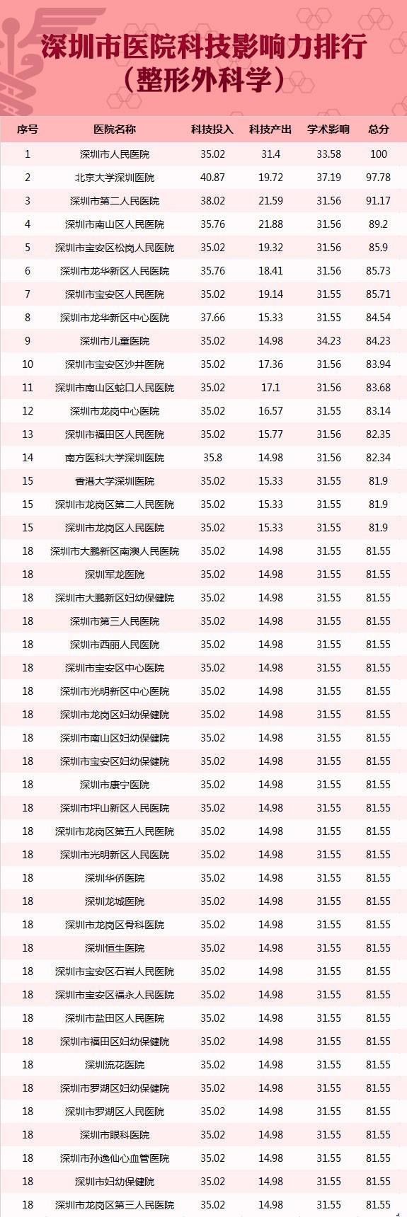深圳市医院科技影响力排行