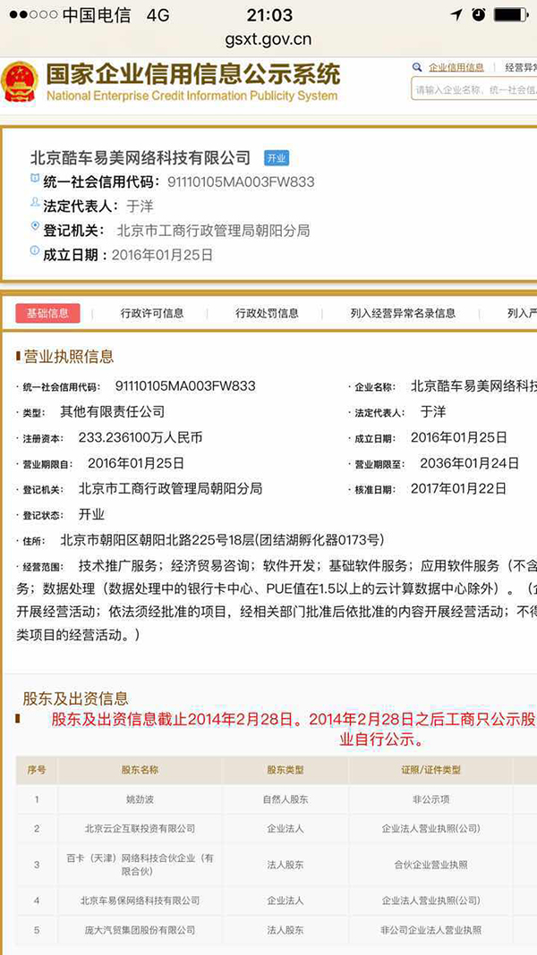 工商资料显示,姚劲波为酷车易美控股股东。从股权结构来看,酷车易美注册资本为233万元人民币,由姚劲波出资73.4万元、北京云企互联投资有限公司出资30.6万元、百卡(天津)网络科技合伙企业出资40.8万元、北京优车优品网络科技有限公司出资59.1万元设立。