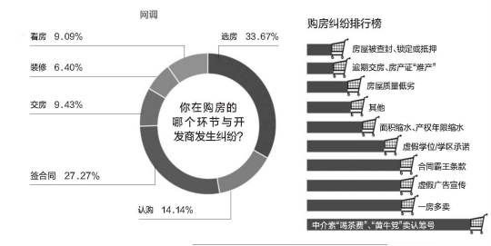 在购房过程中,最容易遭遇陷阱的是选房环节,33.67%的消费者坦言自己在这一过程中和开发商产生过纠纷,其次则是签合同环节,27.27%的购房者在此环节产生问题,位居第三的是认购环节,14 .14%的参与调查者表示自己曾在此环节与开发商产生纠纷。在谈到曾经遭遇过的陷阱时,22 .32%的调查者选择中介索取“喝茶费”、“黄牛党”高价卖认筹号,此外,也各有13%左右的购房者被一房多卖、虚假广告宣传、合同霸王条款等陷阱坑过。
