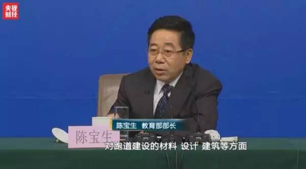 教育部部长陈宝生:对跑道建设的材料、设计、建筑等方面分别制定了标准,这个标准已经经过了充分论证,今年上半年,按照标准发布的程序,要进行适应性调查。在建设程序上,最好是搞“代建”制度,谁中标谁代建,建完之后“交钥匙”,交给学校使用就行了,学校不会搞就别搞了,你不会做饭,你就去上餐馆,不要既不上餐馆又要自己做,做出来又很难吃,有的时候还食物中毒,这就很“奇葩”了。