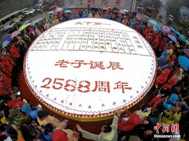 2017年3月12日(农历二月十五)是老子李耳诞辰2588年纪念,道教圣地河南洛阳老君山,世界第一高的老子铜像下,一个超级大蛋糕赶制完成,老子的千古巨著《道德经》也被“写”到了大蛋糕上,大批民众围观,场面宏大。据了解,为赶制这个《道德经》大蛋糕,主办方用了鸡蛋30000枚、白糖900斤、纯牛奶600斤、奶油1200斤等物料,蛋糕总重达5吨。相传河南栾川老君山是道教始祖李耳的归隐地,每年都有大批的信众前去纪念老子诞辰。经老君山道长的加持祈福后,这个超级《道德经》大蛋糕被近万民众陆续分食一空。中新社记者 王中举 摄