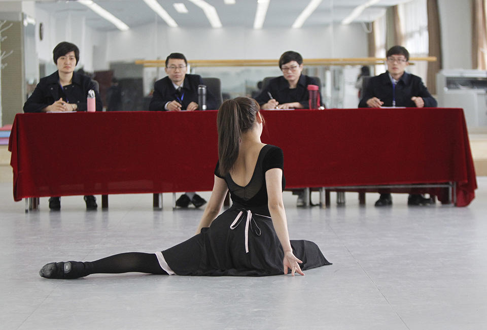 图为考试现场,一名女生在展示才艺。视觉中国