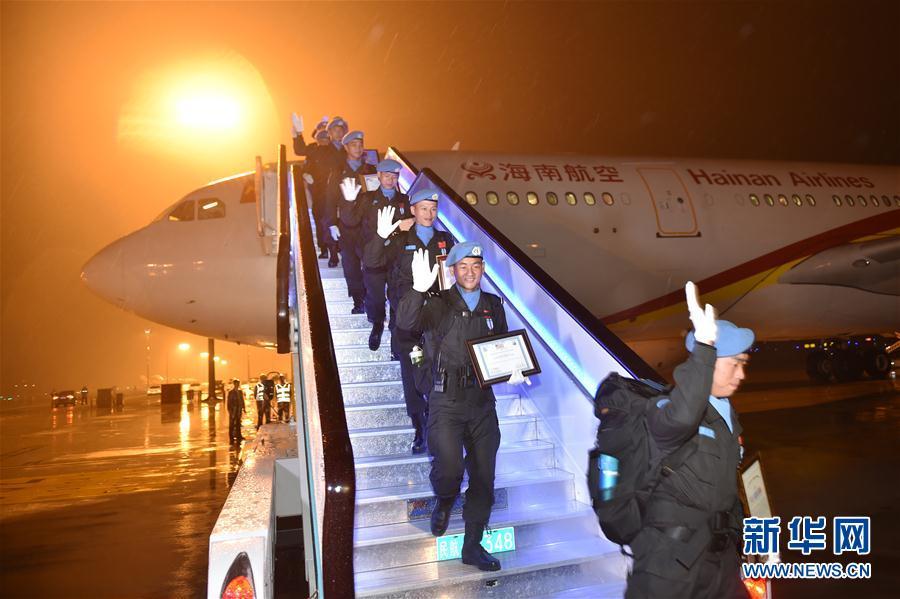 3月12日,在杭州萧山国际机场,中国第四支赴利比里亚维和警察防暴队队员抵达后列队走下飞机。当日,中国第四支赴利比里亚维和警察防暴队圆满完成为期一年的国际维和任务,乘机抵达杭州萧山国际机场。第四支赴利比里亚维和警察防暴队由浙江省公安边防总队为主组建,自2016年3月进驻任务区以来,安全圆满完成各类维和任务627批次,妥善处置群体性事件16起。2017年2月21日,联合国向中国第四支赴利比里亚维和警察防暴队140名队员授予“和平勋章”。新华社记者黄宗治 摄