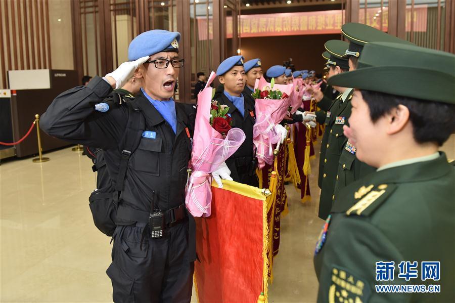 3月12日,中国第四支赴利比里亚维和警察防暴队队员抵达杭州萧山国际机场后在欢迎仪式上列队。新华社记者 黄宗治 摄