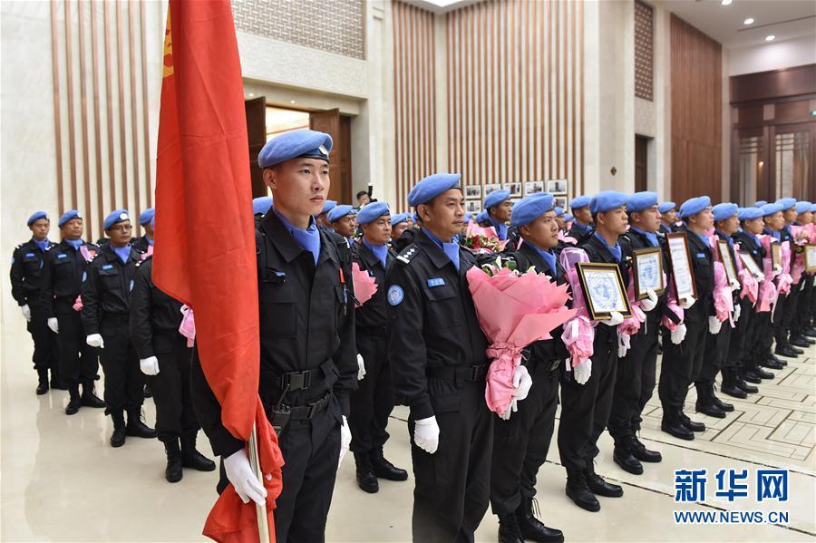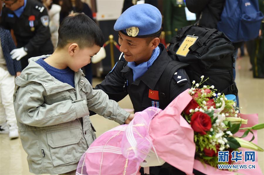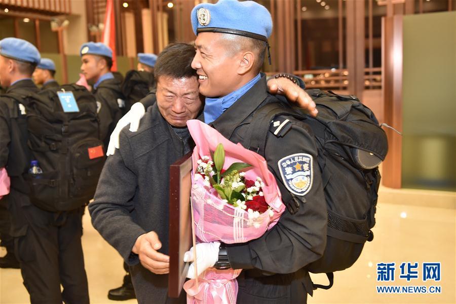 3月12日,在杭州萧山国际机场,中国第四支赴利比里亚维和警察防暴队队员抵达后列队走下飞机。当日,中国第四支赴利比里亚维和警察防暴队圆满完成为期一年的国际维和任务,乘机抵达杭州萧山国际机场。第四支赴利比里亚维和警察防暴队由浙江省公安边防总队为主组建,自2016年3月进驻任务区以来,安全圆满完成各类维和任务627批次,妥善处置群体性事件16起。2017年2月21日,联合国向中国第四支赴利比里亚维和警察防暴队140名队员授予“和平勋章”。新华社记者黄宗治 摄