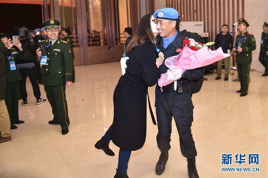 3月12日,在杭州萧山国际机场,中国第四支赴利比里亚维和警察防暴队队员李志杰(右)抵达后与妻子相拥。新华社记者 黄宗治摄
